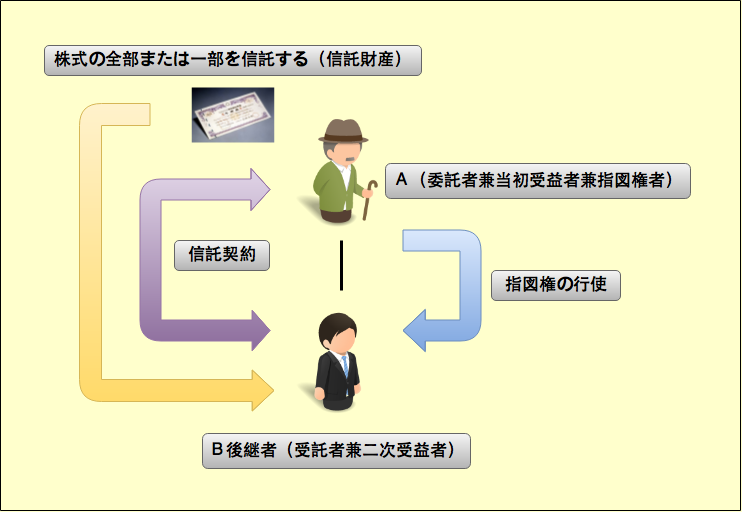 具体的には、オーナー社長Aの保有する株式の全部または一部につき、Aを委託者兼受益者、後継者Bを受託者権二次受益者とし、更に、当面はAを「指図権者(受託者による信託財産の処分・運用等信託事務について、指図をする権利を有する者)」と定め、株主総会での議決権の行使については、指図権者が受託者に指図するものとしておきます。