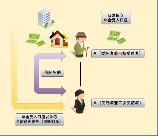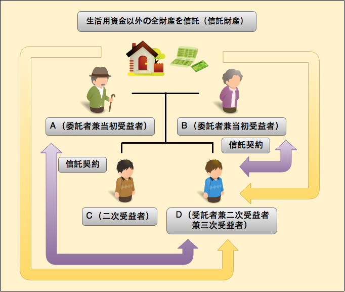 例えば、委託者A及びB夫妻の子Cが精神障害者であるという場合に、Cの弟Dを受託者、A及びBを委託者兼当初受益者とし、二次受益者をC及びD、更に三次受益者をDとする民事信託契約を締結します。その内容として、Cの入所施設や後見人から請求があれば、請求に応じた金額のみをDが給付するものとします。
