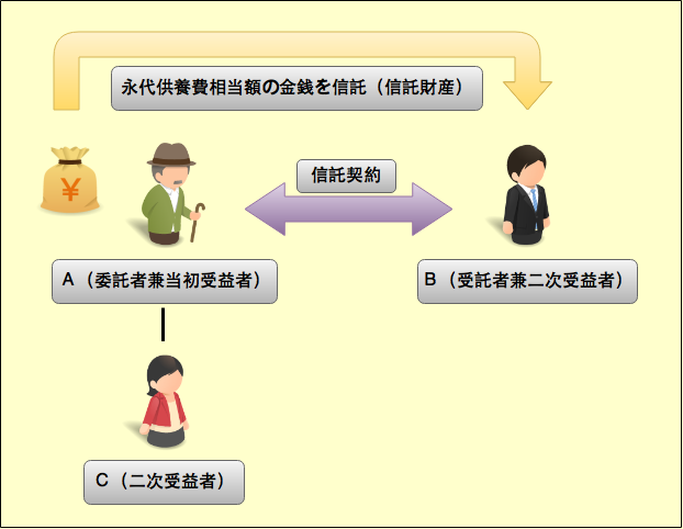 具体的には、財産所有者で永代供養、墓地の管理、法要等を依頼するAを委託者兼当初受益者、実際に永代供養等の管理をする者Bを受託者権二次受益者(負担付受益)、Aの子であるが遠方に住んでいるなどの事情で永代供養等を行えない子Cを二次受益者(負担付受益)とします。